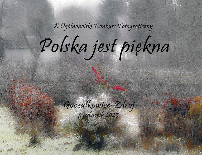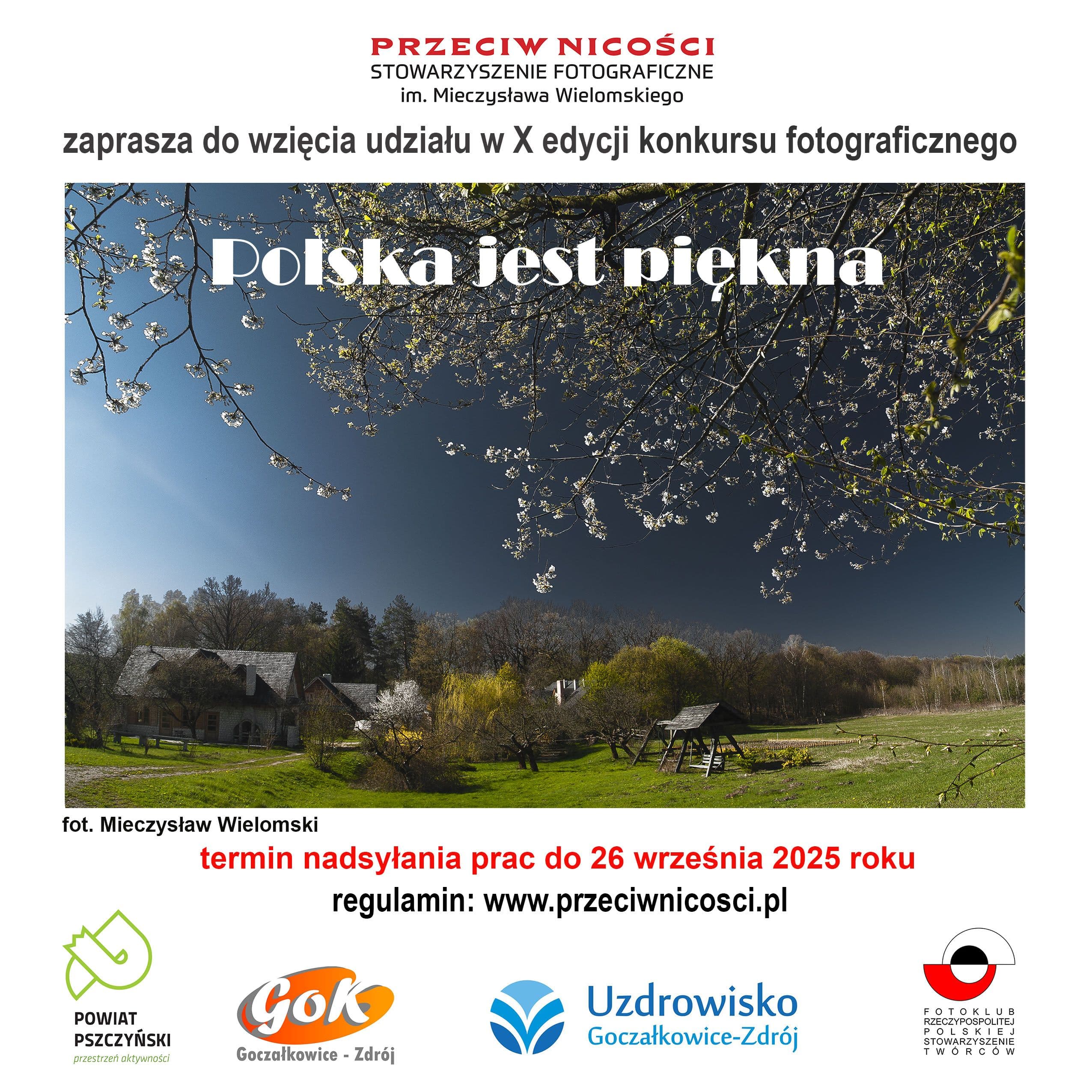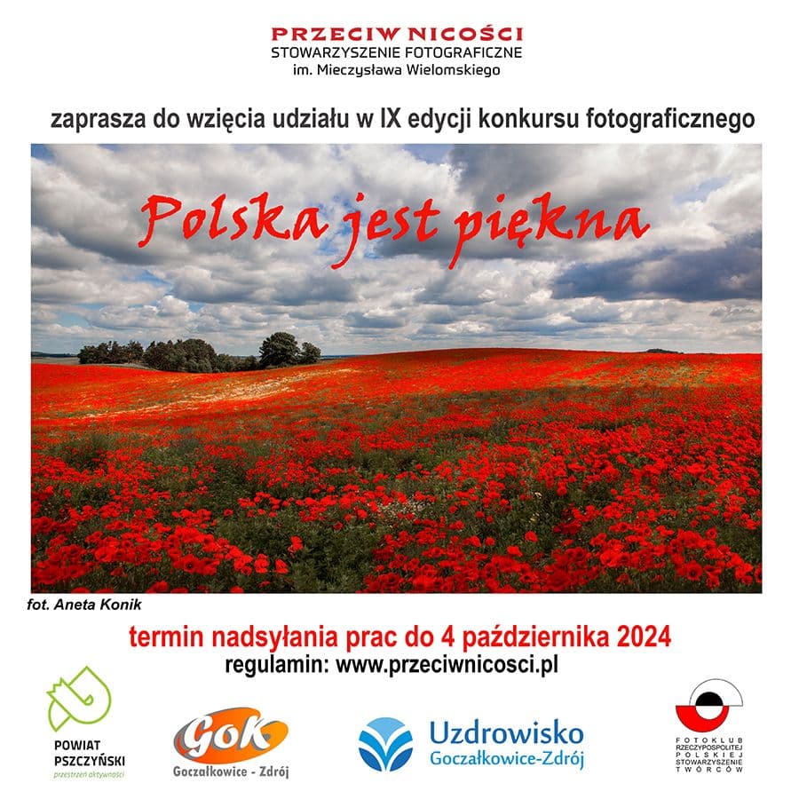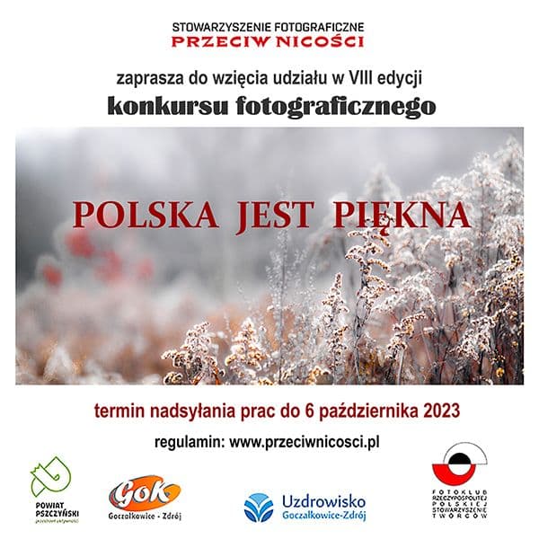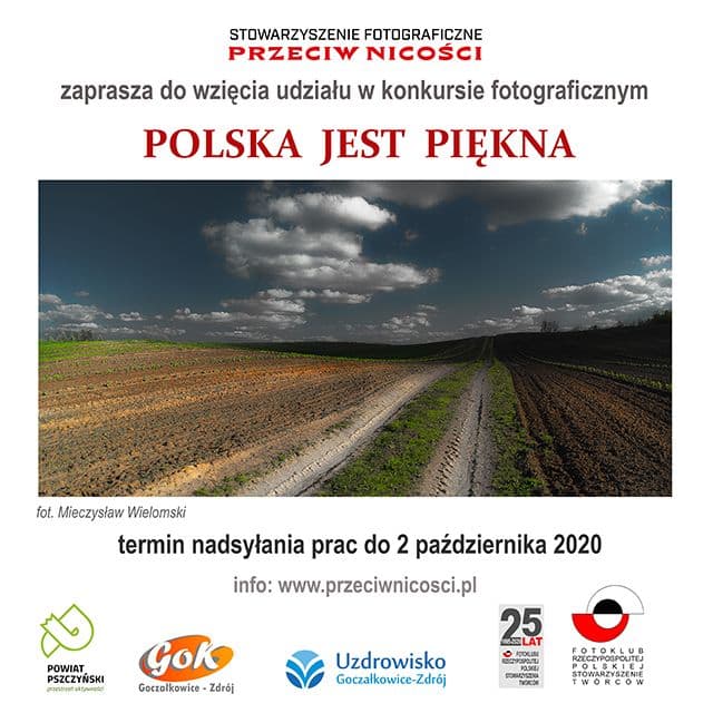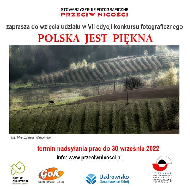 Regulamin konkursu „Polska jest piękna” 15 sierpień – 30 września 2022 roku. Celem konkursu jest popularyzowanie piękna Polski w fotografii artystycznej. Temat można interpretować szeroko: pejzaż wiejski i miejski, atrakcje przyrodnicze i zabytki, ludzie oraz interesujące wydarzenia. ORGANIZATORZY „Przeciw Nicości” Stowarzyszenie Fotograficzne im. Mieczysława Wielomskiego Uzdrowisko Goczałkowice-Zdrój Gminny Ośrodek Kultury w Goczałkowicach-Zdroju Patronat honorowy – starosta pszczyński, pani Barbara Bandoła Patronat artystyczny – Fotoklub RP