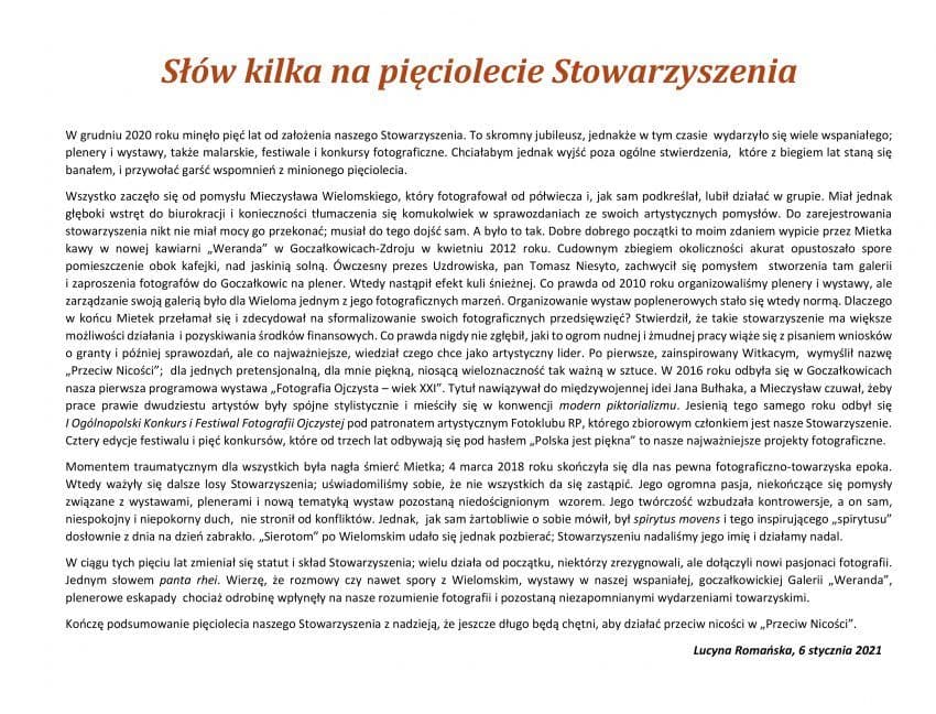 2021 rok zaczynamy wystawą w Gliwicach w Galerii na6. Wernisaż 6 lutego o godz 14:00 Kilka słów o pomyśle na fotoalbum i wystawę: WOKÓŁ KOMINA Pomysł najpierw albumu a później wystawy „Wokół komina” zrodził się wczesną wiosną 2020 roku. Spotkania towarzyskie, dłuższe i dalsze eskapady musieliśmy odłożyć na lepsze czasy. Dlaczego fotografowanie „wokół komina” stało się na pewien czas jedyną możliwością plenerowania? Dzisiaj jest to oczywiste, ale należy się jakieś słowo wyjaśnienia naszym potomkom. Wszystko to za sprawą „niewielkie cząstki zakaźnej infekującej wszystkie formy życia”, czyli niesławnego koronawirusa, SARS-CoV-2. Od marca w mediach na stałe zagościły takie pojęcia jak „lockdown”, „dystans społeczny” i „nowa normalność”. W „normalnej normalności” spotykaliśmy się na plenerach w miejscach powszechnie uznawanych za atrakcyjne turystycznie i fotograficznie, w tej „nowej normalności” zostaliśmy skazani na samotne spacery po najbliższej okolicy. Mieszkamy w różnych, często odległych, częściach Polski, a dzięki fotografii możemy pokazać skrawek naszych małych ojczyzn, do których nasi znajomi rzadko docierają osobiście. Ta wystawa to także sposób na uczczenie pięciolecie istnienia naszego Stowarzyszenia Fotograficznego „Przeciw Nicości” im. Mieczysława Wielomskiego. Te nasze urodzinki obchodzimy w roku jubileuszu dwudziestopięciolecia Fotoklubu RP, którego zbiorowym członkiem mamy zaszczyt być także od pięciu lat. Dziękujemy za zaproszenie gościnnej „Galerii na 6” w Gliwicach. Lucyna Romańska, 25 stycznia 2021 r.